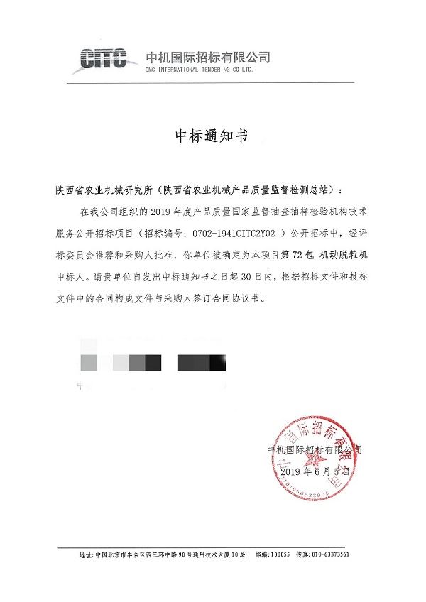 據(jù)中國政府采購網(wǎng)消息,中機(jī)國際招標(biāo)有限公司受國家市場監(jiān)督管理總局科技和財務(wù)司委托,根據(jù)《中華人民共和國政府采購法》等有關(guān)規(guī)定,對2019年度產(chǎn)品質(zhì)量國家監(jiān)督抽查抽樣檢驗機(jī)構(gòu)技術(shù)服務(wù)公開招標(biāo)項目進(jìn)行公開招標(biāo)。6月5日,中國政府采購網(wǎng)發(fā)布國家市場監(jiān)督管理總局科技和財務(wù)司2019年度產(chǎn)品質(zhì)量國家監(jiān)督抽查抽樣檢驗機(jī)構(gòu)技術(shù)服務(wù)公開招標(biāo)項目中標(biāo)公告,陜西省農(nóng)業(yè)機(jī)械研究所(陜西省農(nóng)業(yè)機(jī)械產(chǎn)品質(zhì)量監(jiān)督檢測總站)一舉中標(biāo),成為國家監(jiān)督抽查機(jī)動脫粒機(jī)產(chǎn)品承檢機(jī)構(gòu),并是三家單位中的牽頭單位。這是我所(站)首次參加國抽投標(biāo)并中標(biāo)承擔(dān)國家級監(jiān)督抽查任務(wù)。